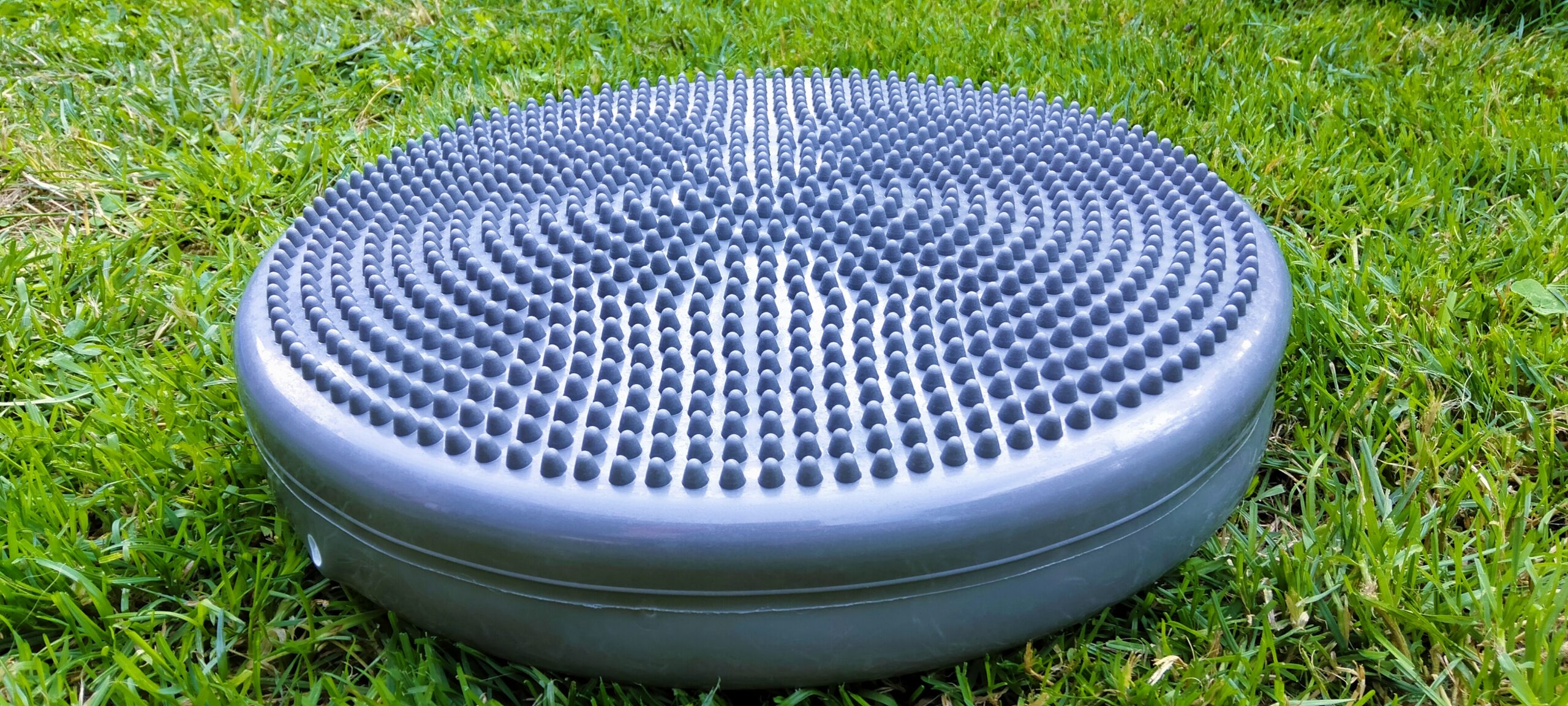 Dysk korekcyjny do siedzenia i treningu równoważnego, rehabilitacji oraz ćwiczeń fitness. Na jednej powierzchni dysk posiada wypustki, które mają około 5-6 mm wysokości.
