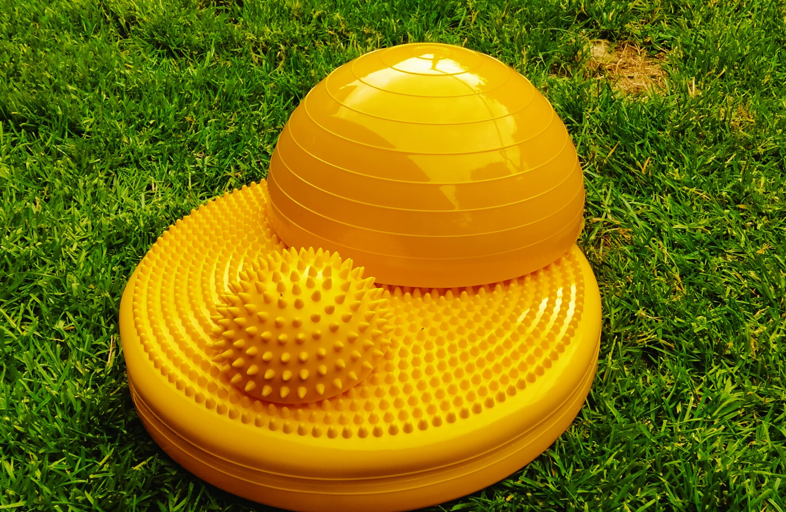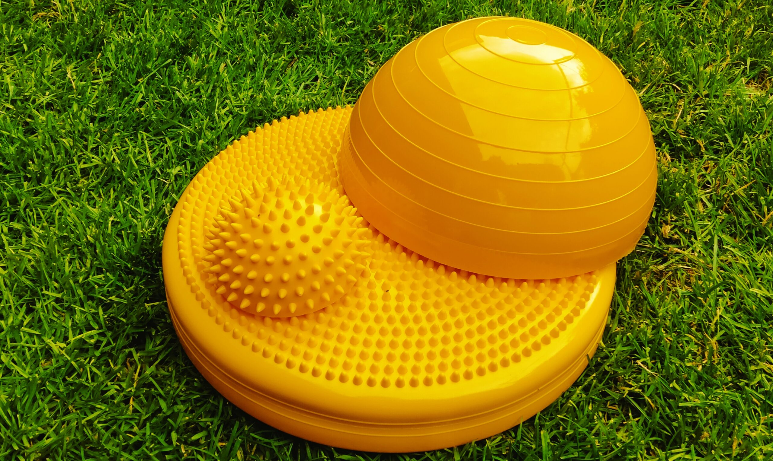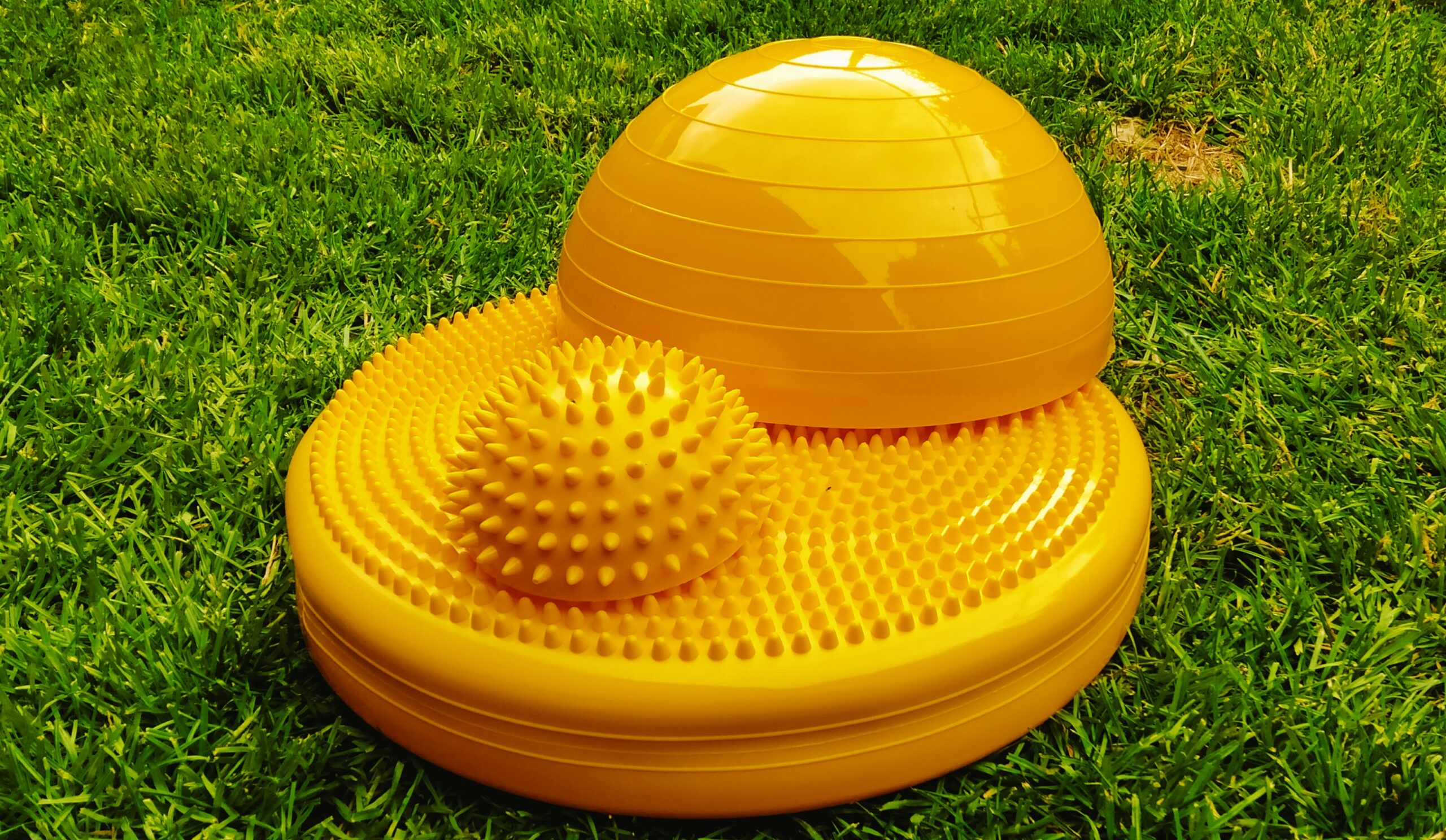 Połącz siłę tych trzech elementów! Stój bosymi stopami na półkuli, utrzymując równowagę na poduszce sensorycznej, jednocześnie tocząc drugą stopę po półkuli z kolcami. To prawdziwy trening dla Twojego mózgu i ciała!