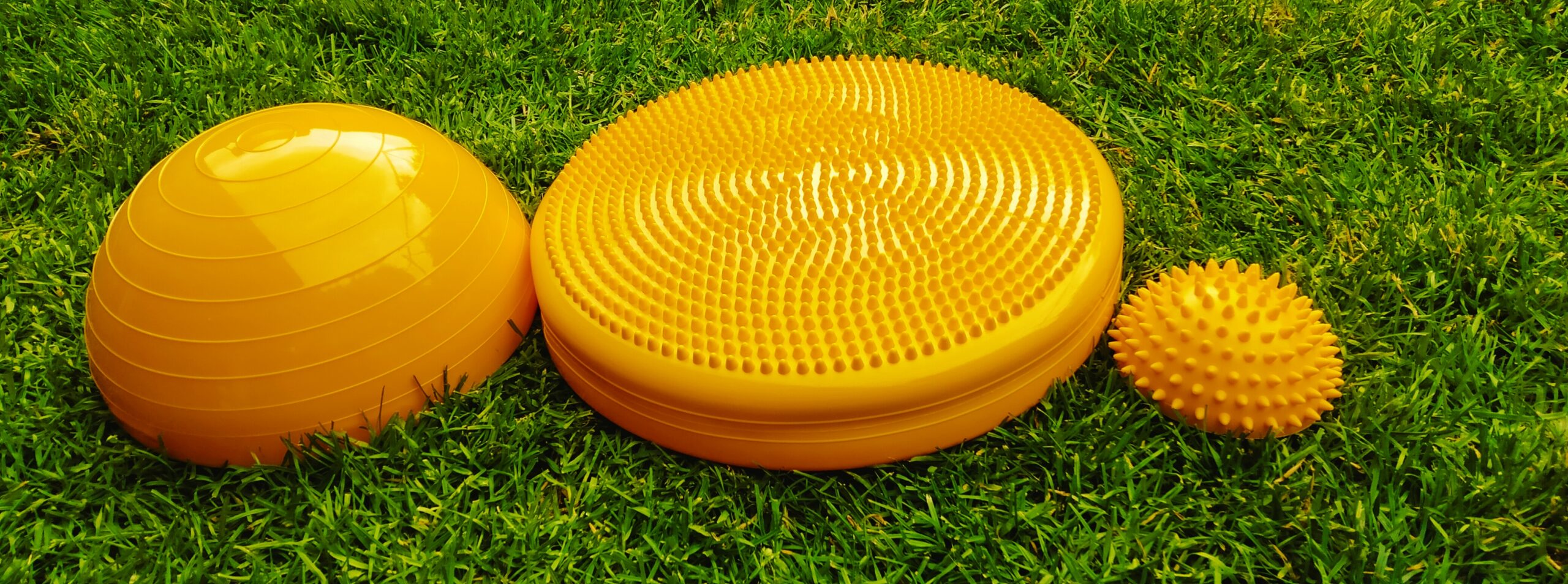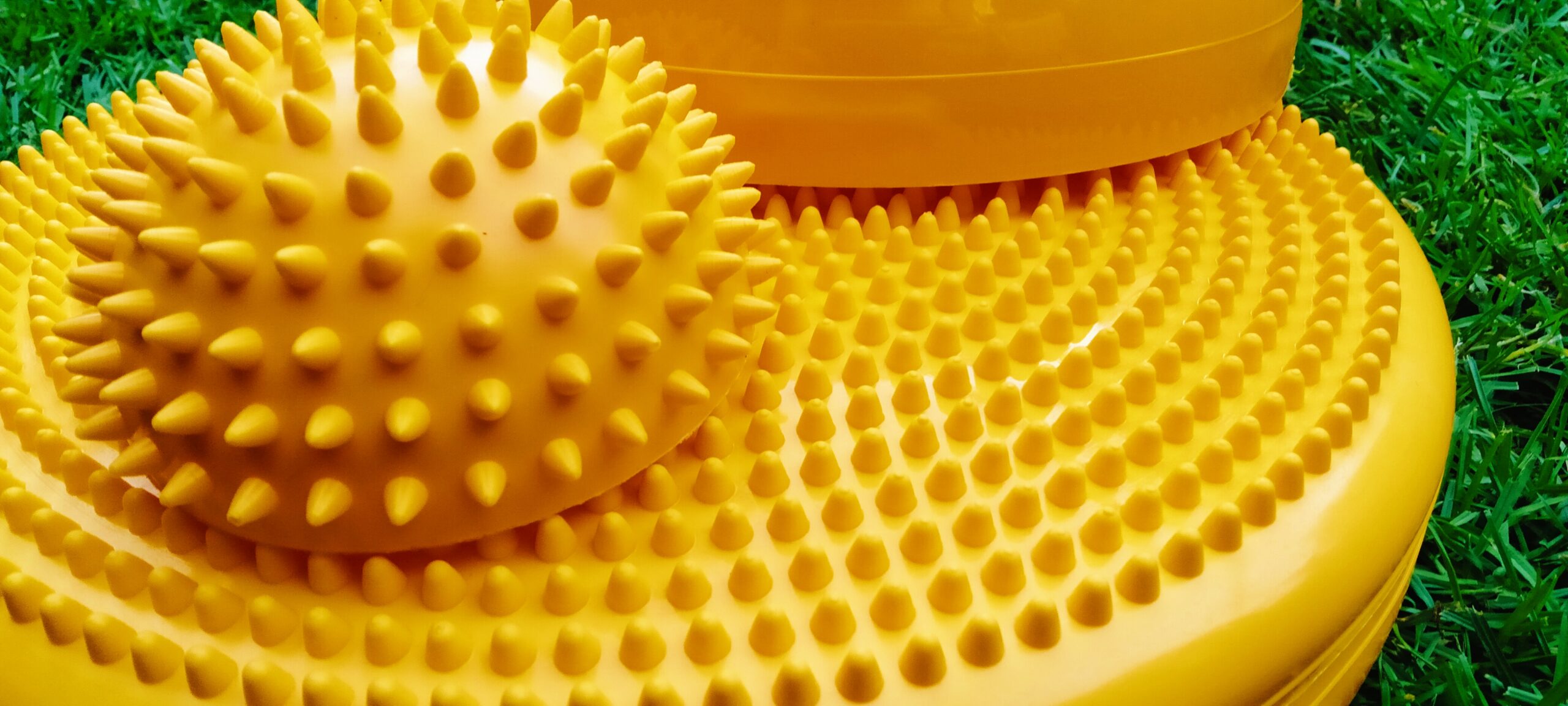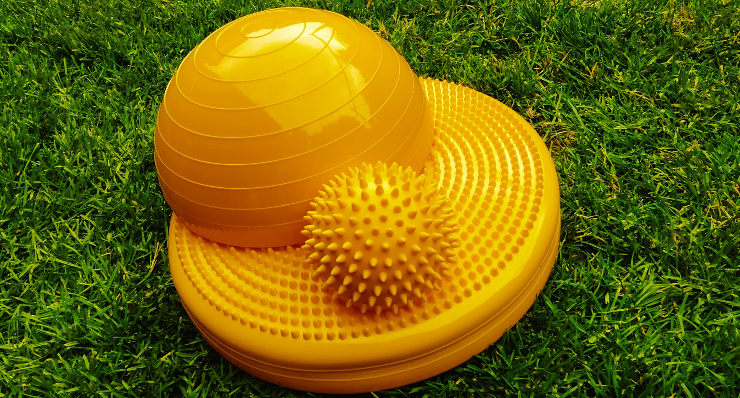 Połącz siłę tych trzech elementów! Stój bosymi stopami na półkuli, utrzymując równowagę na poduszce sensorycznej, jednocześnie tocząc drugą stopę po półkuli z kolcami. To prawdziwy trening dla Twojego mózgu i ciała!